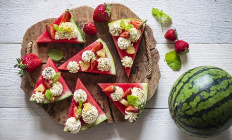 S tímhle receptem se můžete vyřádit podle libosti a zdobit ho různými dobrotami. Plátek melounu nakrájejte na trojúhelníčky.