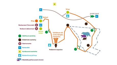 Medvědí stezka je navržená jako klidný rodinný zážitek. Děti tu čeká hledání stop života v lese, pozorování zvířat a interaktivní prvky, které vysvětlují, jak medvědi žijí a proč jsou důležití pro ekosystém.