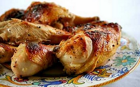 Na pánvi rozehřejeme olej a rychle do zlatova osmahneme kousky masa. Přendáme je na pekáč, vyložený plátky citrónu. Maso přelijeme zbytkem marinády a pečeme v troubě (prsa asi čtvrt hodiny, stehna o pět minut déle).