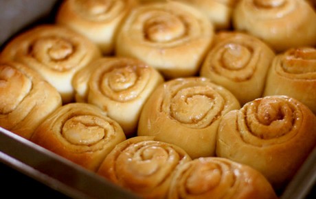 Vykynuté těsto rozdělíme na poloviny, z nichž vyválíme obdélníky asi 30 x 25 cm. Potřeme máslem (jedna lžíce) polovinu obdélníku u delší strany a posypeme náplní. Opatrně srolujeme a roládu nakrájíme na plátky silné 2,5 až 3 cm. Vložíme je do vymazaného pekáče nebo hlubšího plechu a necháme ještě kynout tak 30 minut. V předehřáté troubě pečeme pak při 180 °C asi 25 minut.
