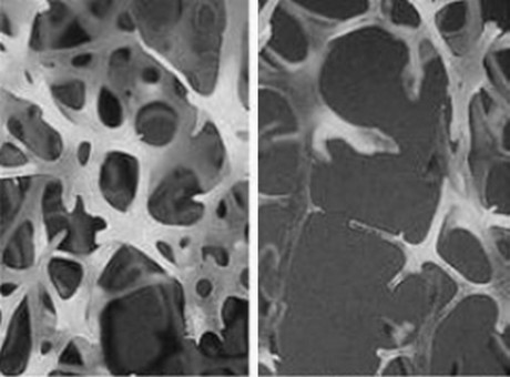 Vlevo zdravá kostní tkáň, vpravo hmota trpící nedostatkem vápníku
