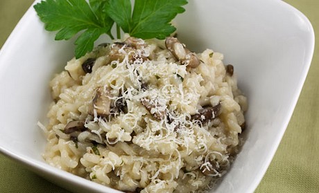 Na pikantní houbové rizoto si připravíme asi 750 g hub (nejlépe hříbků), které pokrájíme a bez soli vydusíme. Jestli jsme našli také žampióny, pár jich oloupeme a necháme stranou.